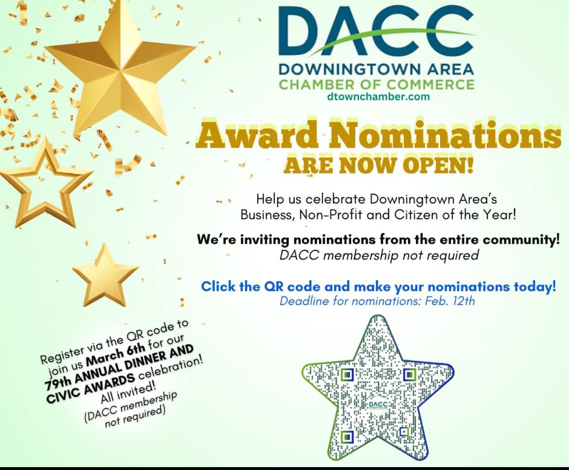 DOWNINGTOWN, PA — The Downingtown Area Chamber of Commerce is inviting the public to submit nominations for its upcoming awards, which aim to celebrate the community’s exceptional businesses, nonprofits, and civic-minded residents. Both Chamber members and non-members are welcome to put forward individuals or organizations that demonstrate significant community impact, strong leadership, and lasting contributions to Downingtown.