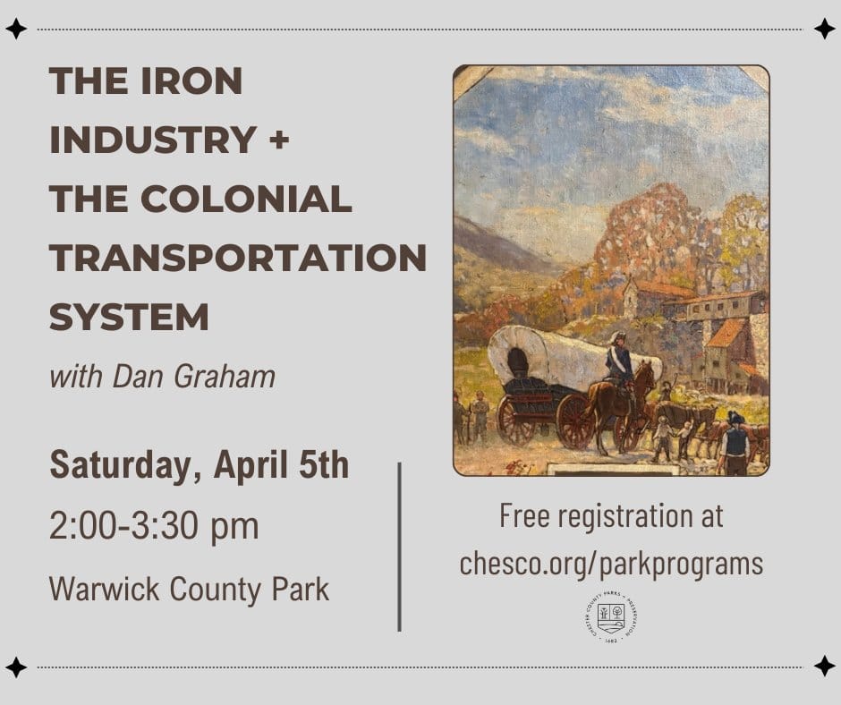 POTTSTOWN, PA — On April 5, Chester County residents can explore a lesser-known chapter of local history at Warwick County Park. The county’s Parks + Preservation department is hosting a program that will examine the role of the iron industry in shaping Chester County’s early infrastructure. Led by historian Dan Graham, the discussion will trace how the industry’s rise in the colonial period led to the creation of vital transportation routes in a region that once lacked a formal road system. The event will begin at 2 p.m. and will take place indoors. Registration is open online.