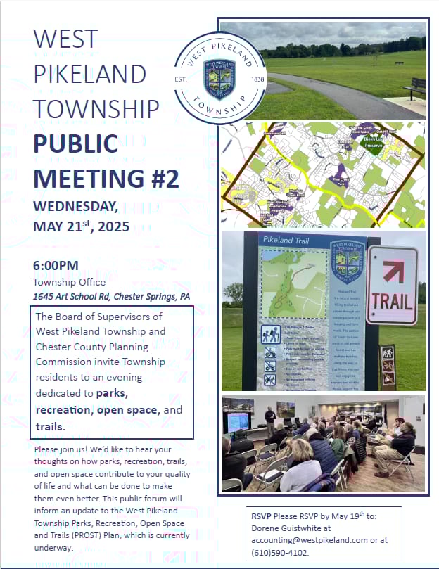WEST PIKELAND TWP — On Tuesday, May 21, at 6 p.m., West Pikeland Township will hold its second public meeting focused on updating its Parks, Recreation, Open Space, and Trails (PROST) Plan. The initiative, developed in partnership with the Chester County Planning Commission, seeks input from township residents on how local parks and open spaces impact their daily lives—and how they might be improved. The meeting offers a chance for community members to share ideas about expanding recreational access, improving trail systems, and preserving open land.