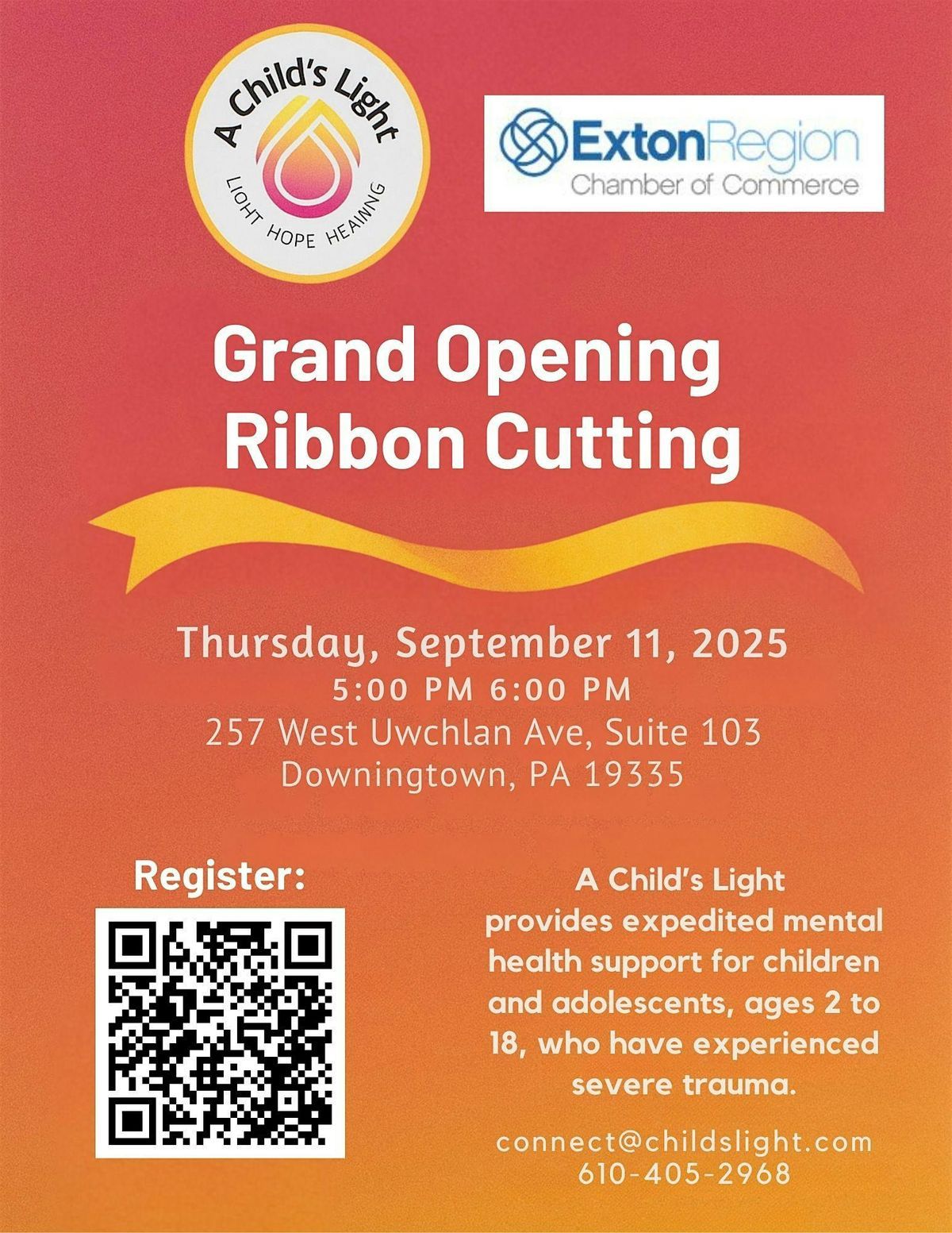 DOWNINGTOWN, PA — On Thursday, September 11, A Child’s Light will celebrate the opening of its new location in Downingtown with a ribbon-cutting ceremony and community reception. Starting at 5 p.m., the event will offer attendees the opportunity to explore the new space, enjoy light refreshments, and connect with local leaders. The ribbon will be officially cut at 5:30 p.m., marking a milestone for the nonprofit, which focuses on providing therapeutic services to children impacted by trauma. Hosted in partnership with the Exton Region Chamber of Commerce, the event invites the public to learn more about the organization’s work and continued commitment to building a supportive community.