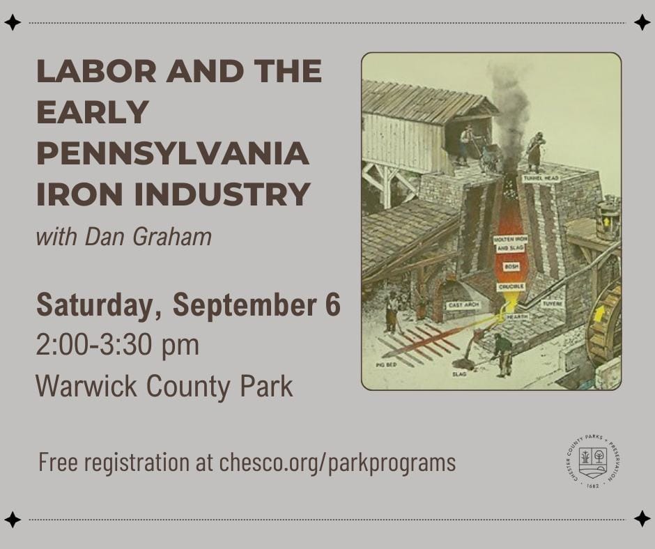 POTTSTOWN, PA β On September 6, Chester County Parks + Preservation will present a free public program delving into the lesser-known labor history of Pennsylvaniaβs early iron industry. Historian Dan Graham will examine how iron masters in the 18th century relied on a diverse and often exploited workforceβincluding indentured servants, redemptioners, enslaved people, and British prisoners of war. The 90-minute session, held at Warwick County Park, aims to highlight the human cost behind one of the regionβs foundational industries. Pre-registration is required to attend.