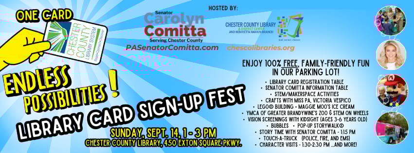 EXTON, PA β To celebrate Library Card Sign-Up Month, Chester County Library in Exton will host its third annual Sign-Up Fest on Sunday, September 14, from 1 to 3 p.m. The event offers an afternoon of free activities for families, including STEM and Makerspace stations, KidSight vision screenings, bookmark-making with Miss Pennsylvania, and story time. Visitors can enjoy free ice cream, character visits, and touch-a-truck experiences with local first responders. Donations of new or gently used childrenβs books will be collected to benefit local nonprofits. The event is free but registration for a library card is encouraged.