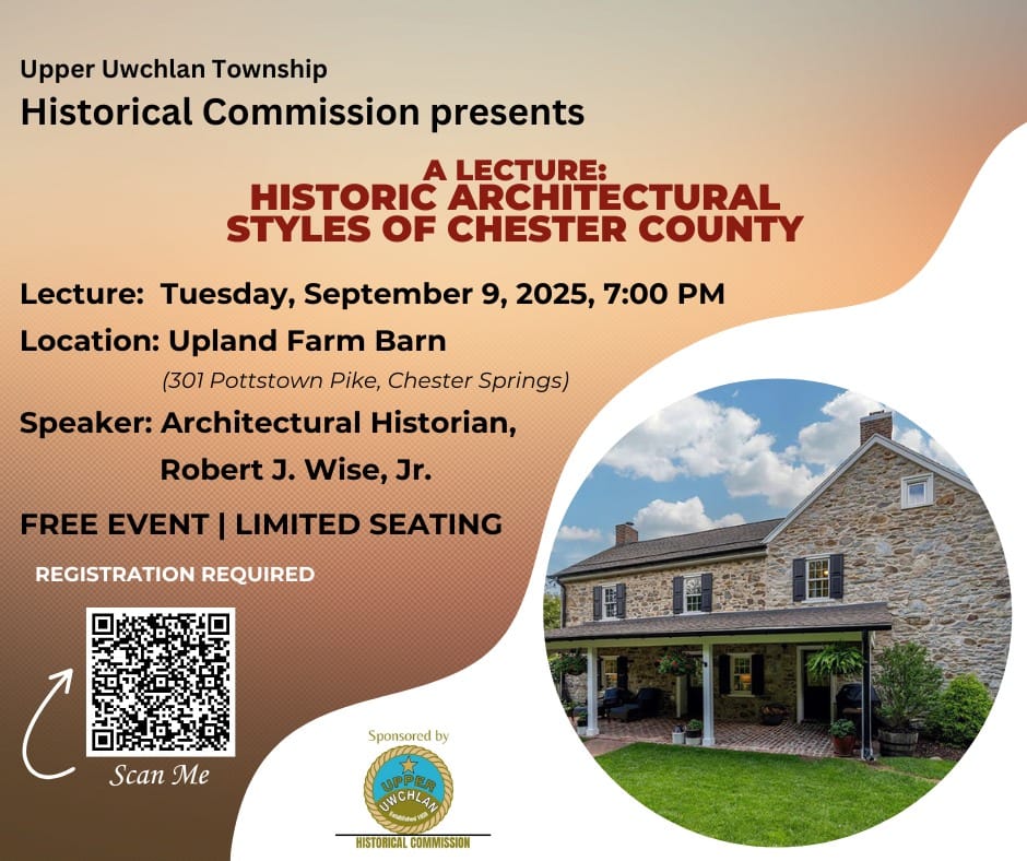 UPPER UWCHLAN TWP β Upper Uwchlan Township will host a free lecture on Tuesday, September 9 at 7 p.m., featuring architectural historian Robert J. Wise, Jr. The event will explore the evolution of Chester Countyβs distinctive structures, including early log cabins, stone farmhouses, and historic estates. Designed to offer a deeper appreciation of the regionβs architectural legacy, the lecture is open to the public, but advance registration is required.