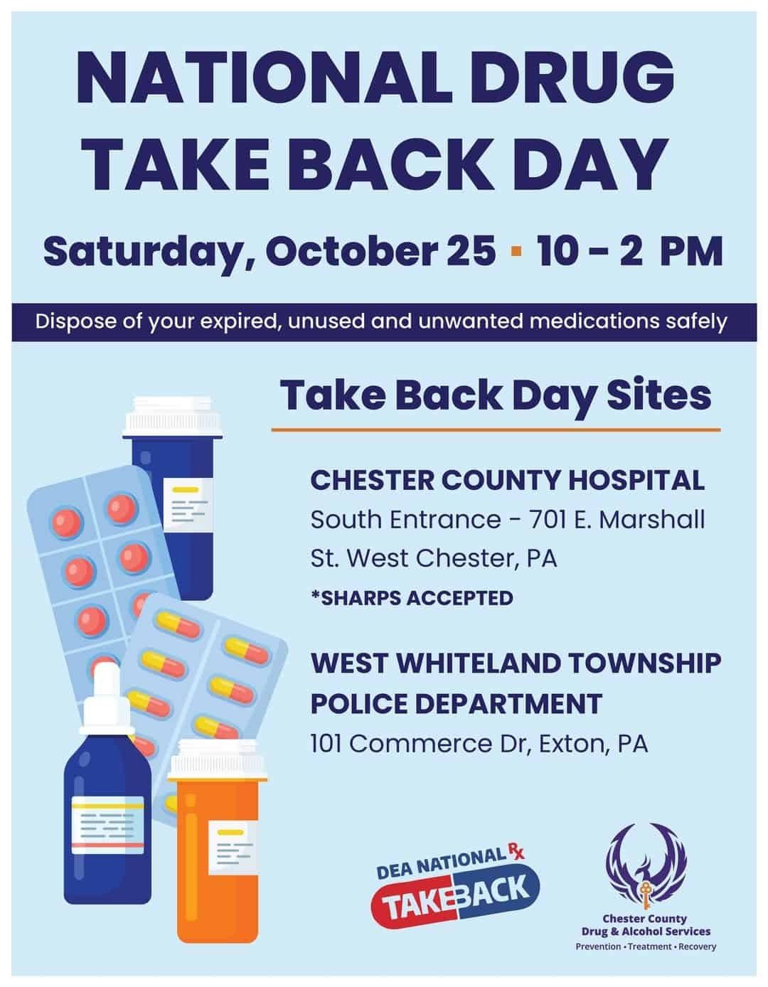 EXTON, PA —On Saturday, October 25, Chester County will host a medication take-back event from 10 a.m. to 2 p.m. at two drop-off sites: Penn Medicine Chester County Hospital and the West Whiteland Township Police Department. The initiative encourages safe disposal of expired or unused medications to reduce the risk of misuse and environmental harm. In addition to the one-day event, residents can access secure medication drop boxes year-round at multiple locations throughout the county. More information is available at chesco.org/2673/Medication-Disposal.