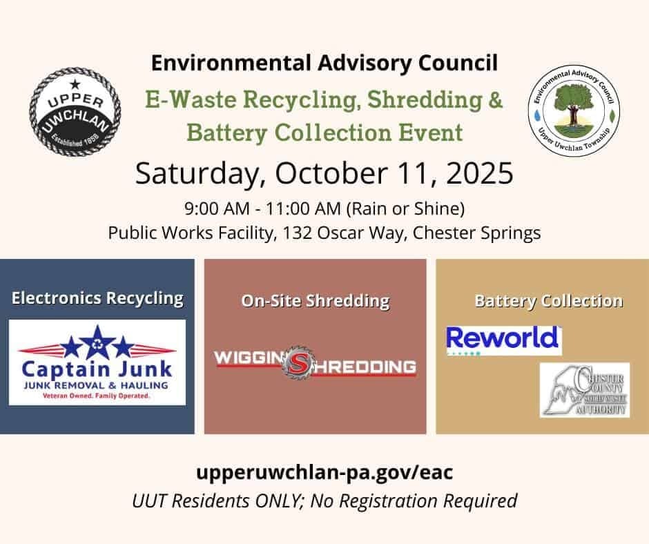 UPPER UWCHLAN TWP — On Saturday, October 11, Upper Uwchlan Township will host a community event to collect electronic waste, sensitive documents, and rechargeable batteries for proper disposal. Scheduled from 9:00 to 11:00 a.m. at the Public Works Facility on Oscar Way, the initiative is open exclusively to township residents.