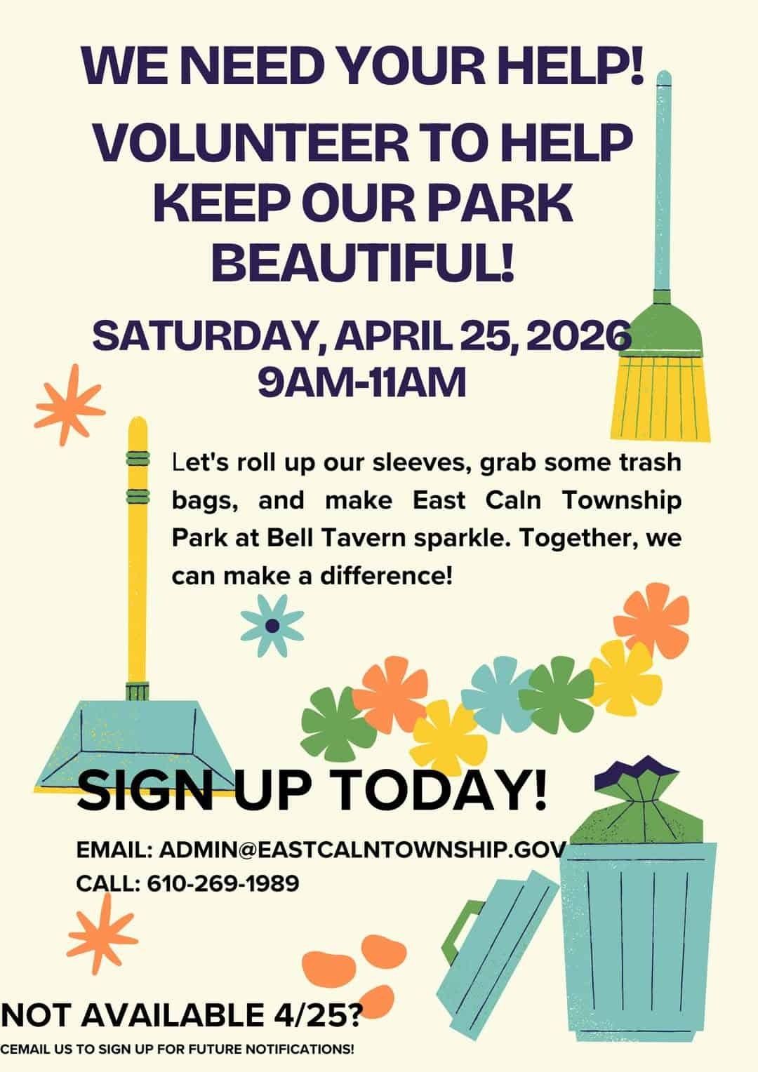 EAST CALN TWP — East Caln Township is organizing a community cleanup event at East Caln Township Park at Bell Tavern on Saturday, April 25, from 9 a.m. to 11 a.m. The township is seeking volunteers to help remove litter and maintain the park, which serves as an important recreational space for local families. Officials say the initiative is part of a broader effort to engage residents in environmental stewardship and preserve shared public spaces. Those interested in participating can register by contacting the township administration office via email at [email protected] or by calling 610-269-1989. Residents who cannot attend the April cleanup can request to be added to a notification list for future volunteer opportunities.
