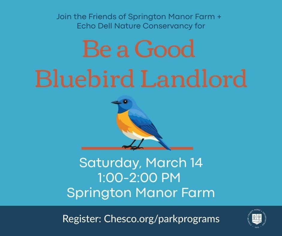 GLENMOORE, PA — Chester County Parks and Preservation is offering a workshop on how to attract and support bluebirds on private property. Scheduled for Saturday, March 14, from 1 to 2 p.m. at Springton Manor Farm, the program will be led by Nancy Fraim, the Chester County Coordinator for the Bluebird Society of Pennsylvania. Participants will learn best practices for monitoring nesting boxes, seasonal care techniques, and how to create appropriate bird habitat. The workshop is co-hosted by the Friends of Springton Manor Farm and Echo Dell Conservancy. Bluebirds have recovered from population declines in recent decades, largely due to nest box programs and conservation efforts. Interested residents can register online through the Chester County Parks website.