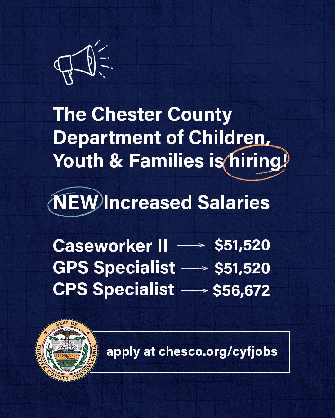 WEST CHESER, PA — The Chester County Department of Children, Youth and Families has increased salaries for caseworker positions as part of ongoing recruitment efforts. Caseworker II and GPS Specialist roles now start at $51,520 annually, while Caseworker Specialist positions begin at $56,672. The salary adjustments address staffing challenges that have affected child welfare departments across Pennsylvania and the nation, where high turnover rates and recruitment difficulties have become persistent concerns. The positions involve investigating child abuse and neglect reports, coordinating family services, and managing complex cases through the child welfare system. Chester County offers full-time employees comprehensive benefits including medical coverage, paid time off, retirement plans, and life insurance. Interested candidates can apply through the county's employment website.