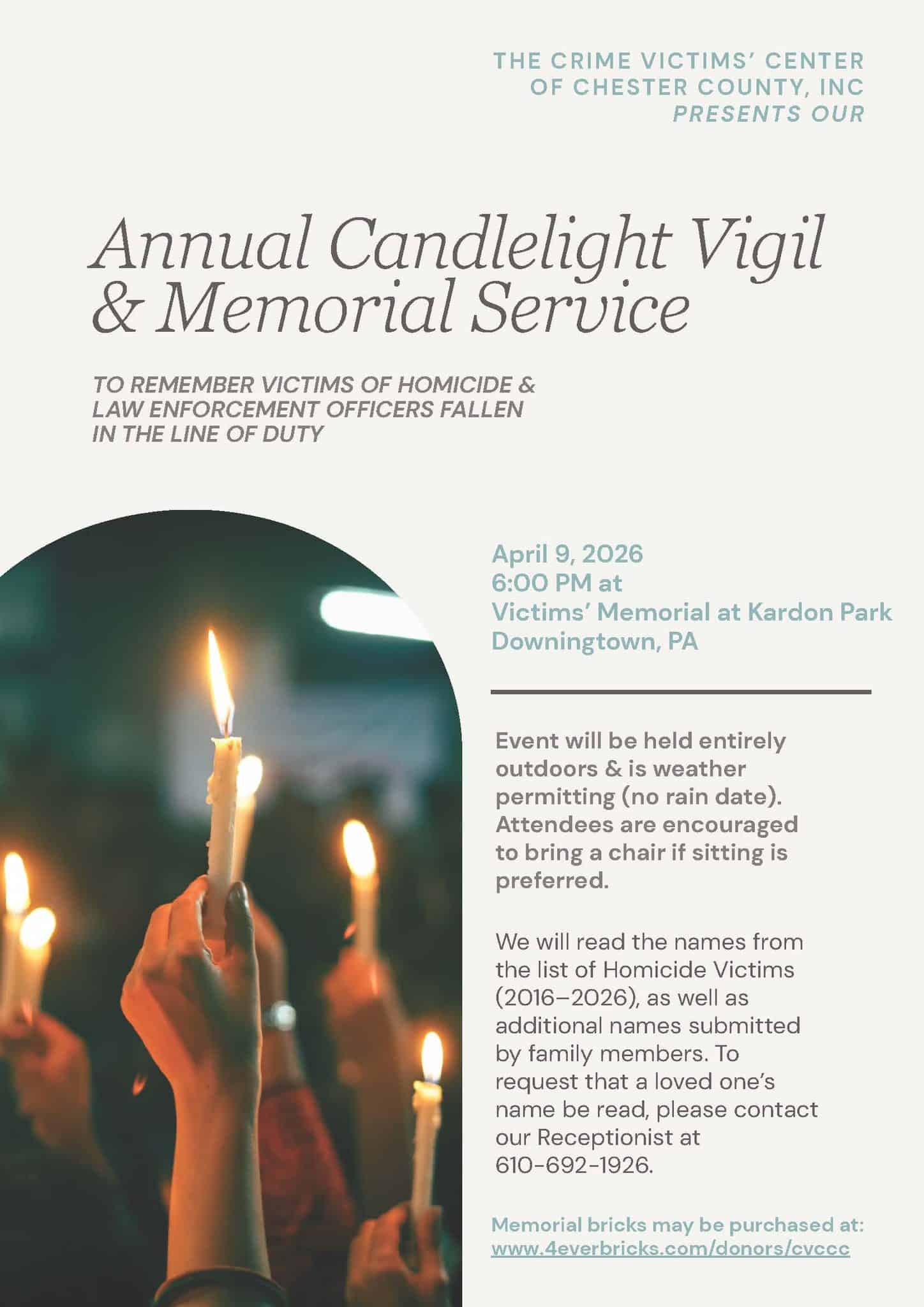 Central to the service is a reading of names — a practice that gives individual acknowledgment to those who might otherwise be reduced to statistics. The center will read the names of homicide victims from 2016 through 2026, and family members may request that additional names be included by reaching out to the center's receptionist at 610-692-1926 ahead of the event. For those seeking a permanent way to honor a loved one, memorial bricks can be purchased at www.4everbricks.com/donors/cvccc.