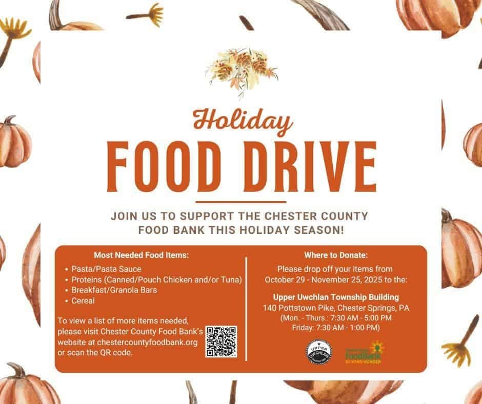 CHESTER SPRINGS, PA — Upper Uwchlan Township is conducting a holiday food drive through Nov. 25, with donations accepted at the township building on Pottstown Pike in Chester Springs. The drive saw its first donation boxes fill within a day of launching. The township is making rolling deliveries to the Chester County Food Bank, with priority needs including pasta, proteins, breakfast items, and cereal. Donors should avoid glass containers.