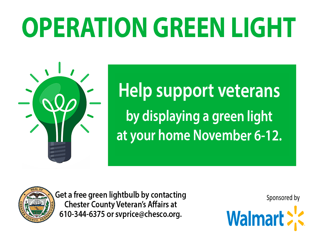The Chester County Commissioners and Department of Veterans Affairs are backing Operation Green Light, a nationwide initiative recognizing veterans' contributions from November 6-12. To support this initiative, Chester County will illuminate the façade of the Historic Courthouse in green, distribute green light bulbs to residents, and organize a public ceremony on November 6. Operation Green Light aims to raise awareness of veterans' unique challenges and available resources while expressing gratitude for their sacrifices. Chester County encourages residents to join by shining green light bulbs during the specified dates to show appreciation to veterans and their families.
