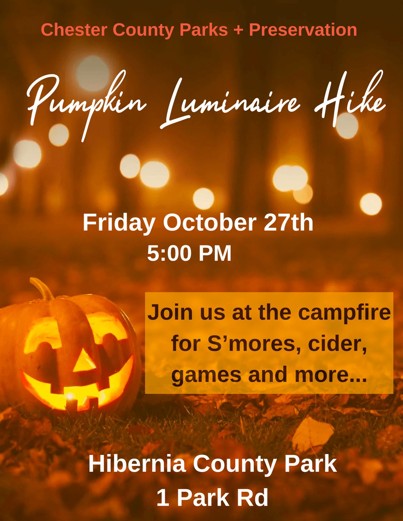 Pumpkin Luminaire Hike at Hibernia County Park, a family-friendly event celebrating the beauty of autumn. It's set to take place on October 27th from 5:00 PM to 8:00 PM, with free parking and admission. The event includes a self-guided hike with illuminated pumpkins, live music, campfires with s'mores, cider, kids' pumpkin table games, wagon rides, cornhole, and a photo booth. It promises to be a delightful and memorable fall outing for families and individuals in Coatesville