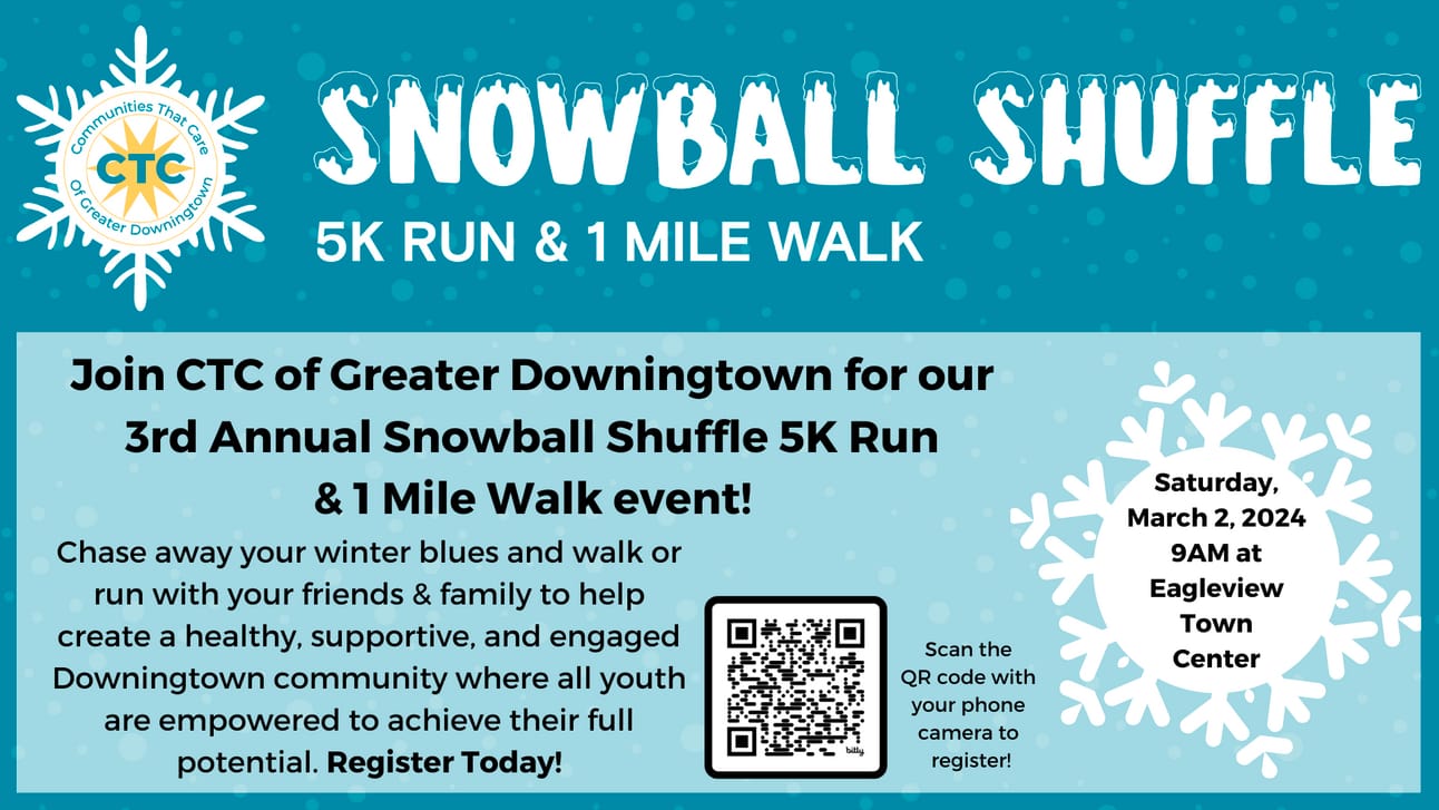 Communities That Care of Greater Downingtown (CTC) announces the return of the Snowball Shuffle, a 5K Run and 1 Mile Walk, set for March 2, 2024, at Eagleview Town Center. Open to all, the event encourages community unity, with registration at $30 per person. The fee includes a long sleeve sweatshirt, access to a hot chocolate bar, a s'mores station, and more. Prizes are up for grabs in categories like Best Costume and Most Team Spirit. CTC expresses gratitude to sponsors and local businesses supporting the event.