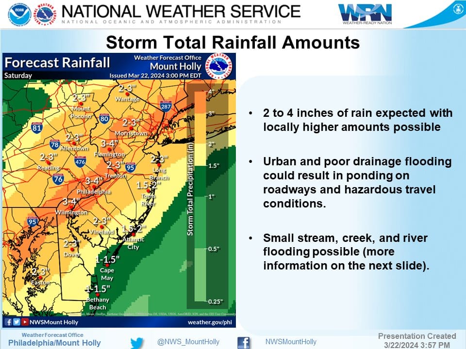 CHESTER COUNTY — As a storm approaches the region, forecasters have heightened concerns over increased rainfall and flooding risks. The briefing package issued for the impending weather event indicates a notable uptick in precipitation along the I-95 corridor. This escalation in rainfall raises the probability of river flooding, particularly in regions such as northern New Jersey and lower Delaware River tributaries. Projections suggest minor flooding in these areas, with the potential for moderate river flooding, particularly within the Passaic and Raritan basins.