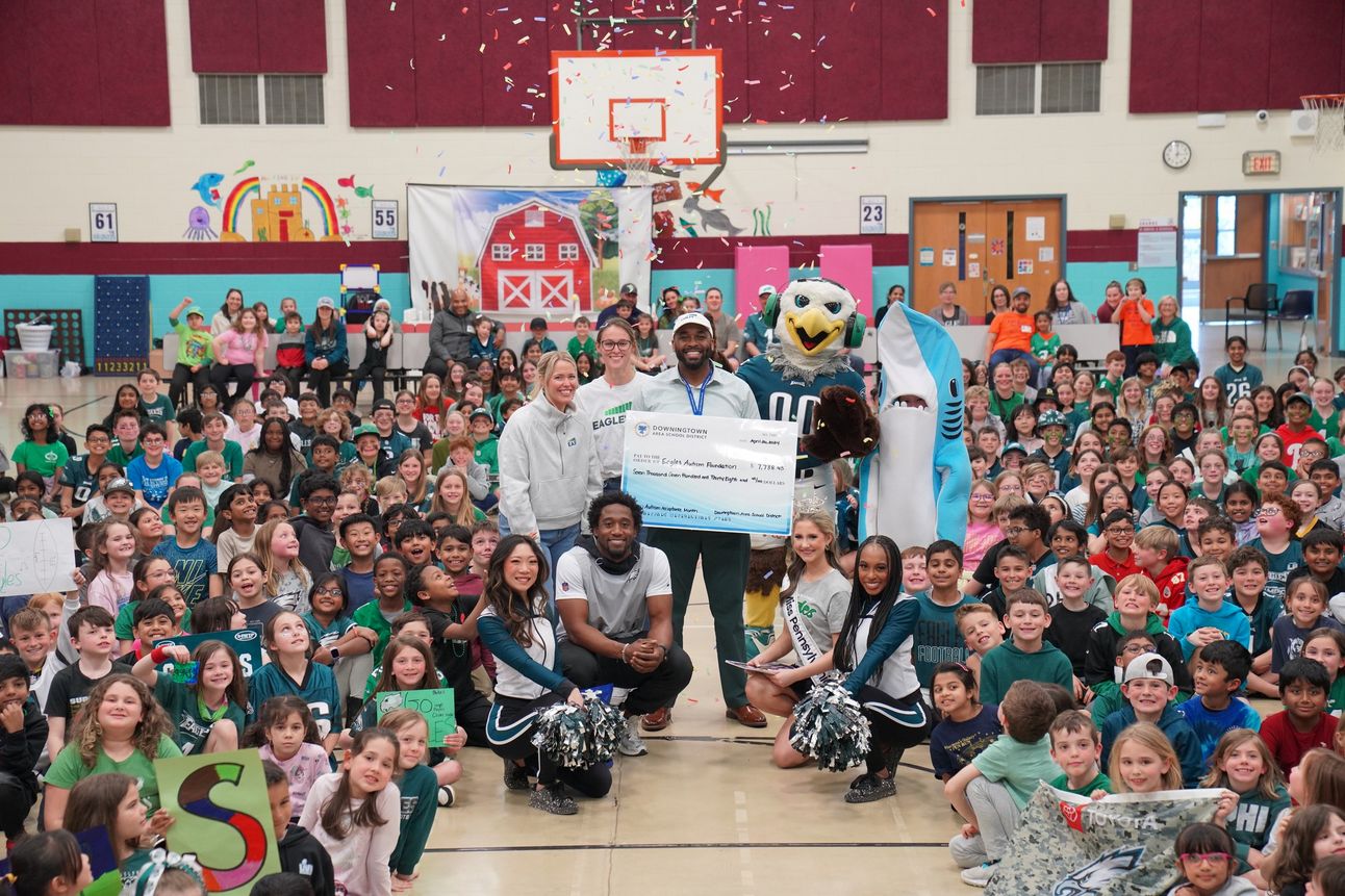 DOWNINGTOWN — Bradford Heights Elementary and Shamona Creek Elementary won the Downingtown Area School District’s annual coin challenge, raising funds for the Eagles Autism Foundation. Their victory brought a visit from notable guests including Kylie Kelce, cornerback Zech McPhearson, Eagles’ cheerleaders, and Swoop, contributing to the celebration of their $7,731.67 collective contribution.