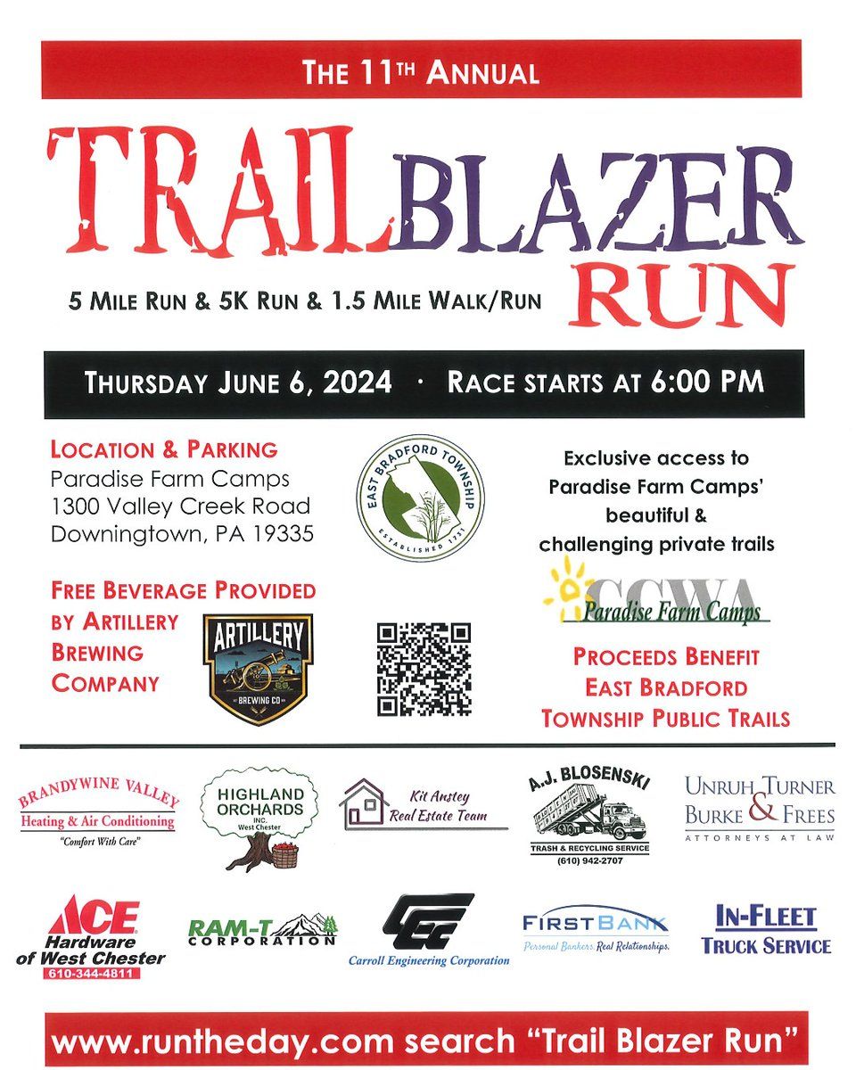 EAST BRADFORD TWP — East Bradford announces the 2024 Trail Blazer Run for June 6, featuring a new 5K race to complement the established 5-mile and 1.5-mile events at Paradise Farm Camps. The annual event, which supports the township's extensive trail program, invites runners of all abilities to participate and benefit the local community. Registration is discounted through the Run The Day website, and the township is actively seeking sponsors to help support the growing network of public trails.