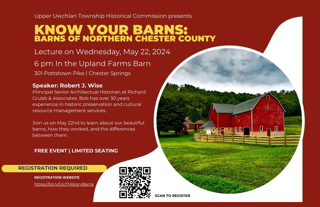 UPPER UWCHLAN TWP — On May 22, the Upper Uwchlan Township Historical Commission invites the community to a special presentation, "Know Your Barns: Barns of Northern Chester County." The event will feature Robert J. Wise, a seasoned architectural historian with over three decades of experience, who will discuss the structural and functional aspects of the region’s barns. This session is designed to enrich knowledge of local agricultural and architectural heritage. Advance registration is necessary due to limited seating.