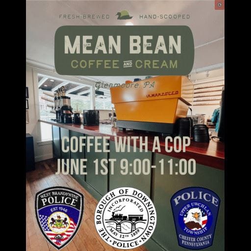 GLENMOORE, PA — The Downingtown Police Department, together with the West Brandywine and Upper Uwchlan police departments, will host a "Coffee with a Cop" event on Saturday, June 1, from 9 a.m. to 11 a.m. at Mean Bean Coffee and Cream in Glenmoore. This event aims to foster community connections by providing residents an opportunity to engage with local police officers in a relaxed, informal setting. Overflow parking for the event is available at Wagonseller Park, located across the street.