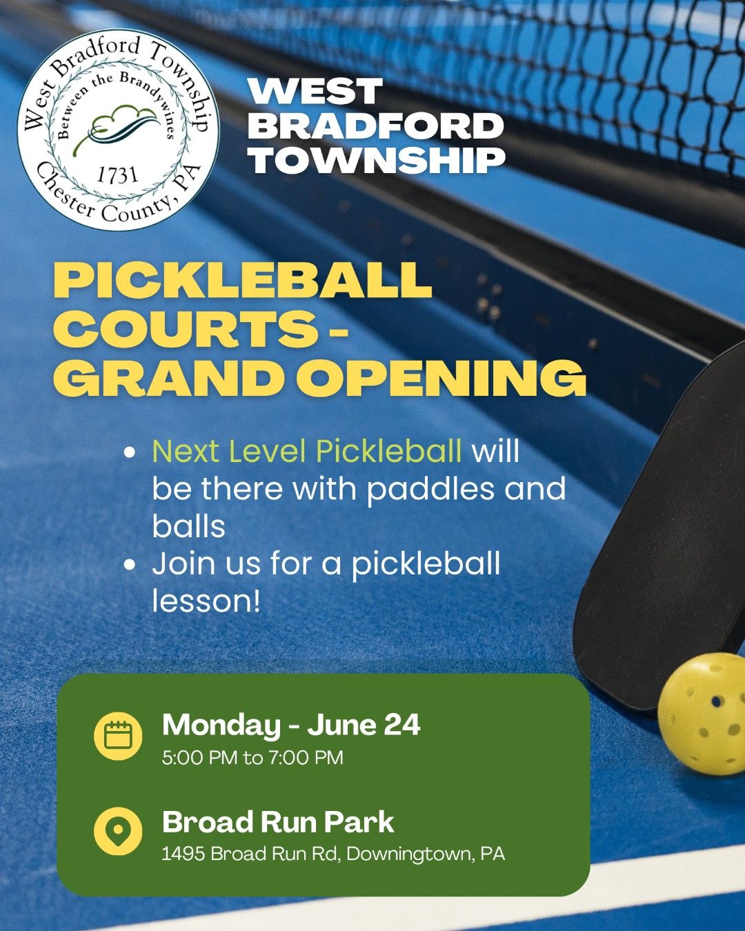 WEST BRADFORD TWP — On Monday, June 24, from 5:00 to 7:00 PM, West Bradford Township will hold a grand opening event for its new pickleball courts at Broad Run Park, 1495 Broad Run Road in Downingtown. The event, designed to introduce residents to the game of pickleball, will feature lessons and equipment provided by Next Level Pickleball. Participants will have the opportunity to learn the basics of the game and enjoy an evening of community engagement. The event is open to all, from beginners to experienced players.