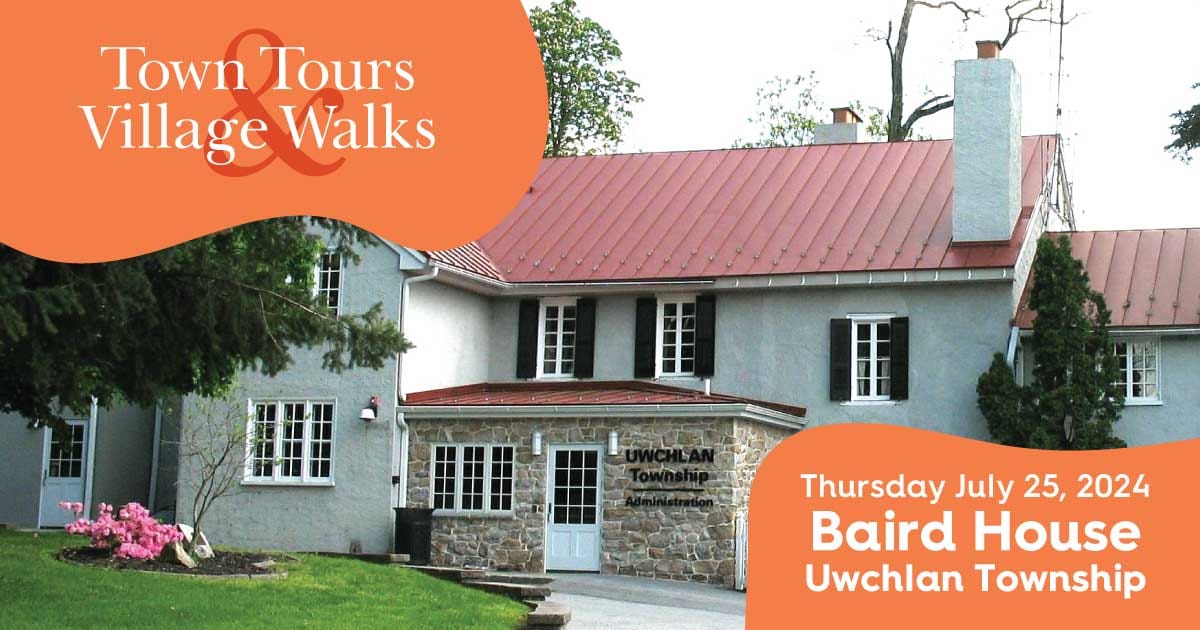 UWCHLAN TWP - As part of Chester County's 30th annual Town Tours and Village Walks program, a tour of the historic Baird House and Uwchlan Township Building is scheduled for Thursday, July 25. The property, dating back to 1735, includes a preserved log house and other early structures. Attendees will also be able to explore the grounds, which feature ponds, outbuildings, a log house replica, gardens, and a Veterans' Memorial.