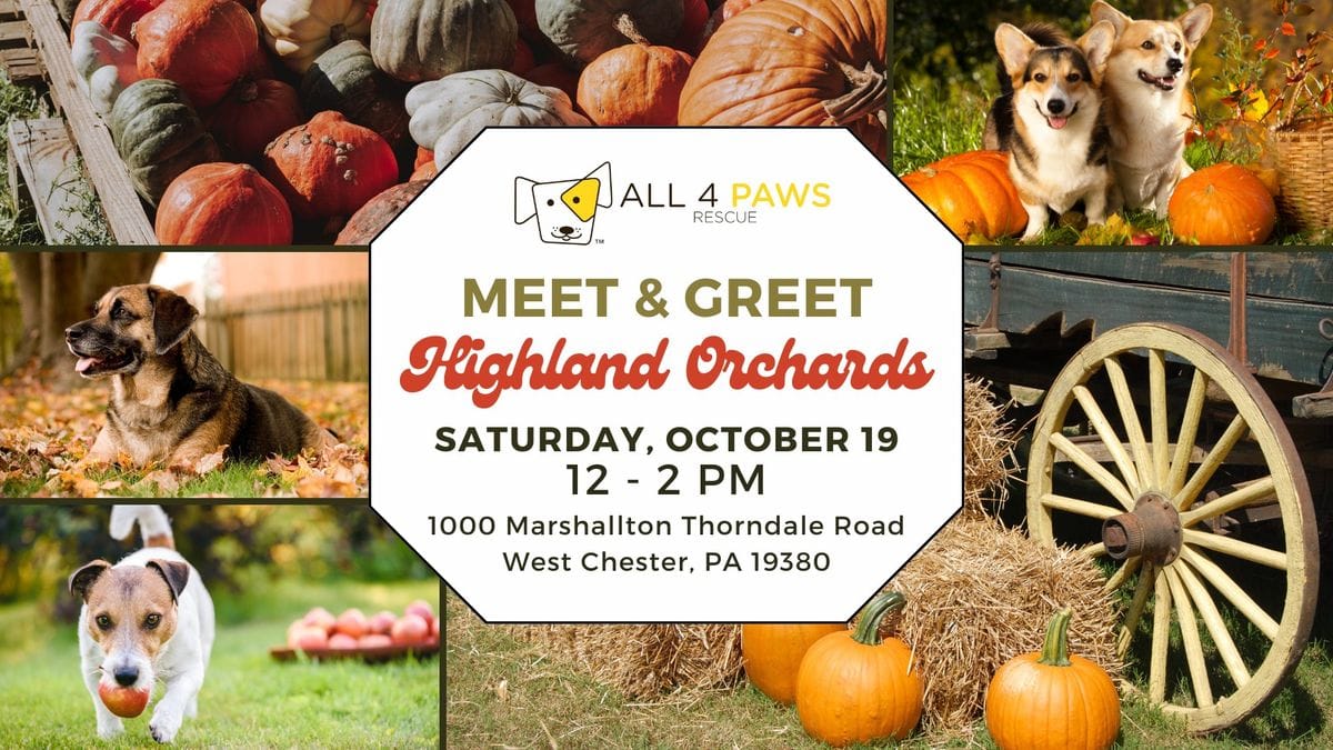 DOWNINGTOWN, PA β Highland Orchards in West Chester invites the community to a Meet & Greet event hosted by All 4 Paws Rescue, offering a chance to meet adoptable dogs amid the orchard's fall activities from 12 to 2 p.m. Visitors can enjoy hayrides, apple picking, and cider donuts while interacting with the rescueβs dogs. Although no adoptions are processed during the event, approved adopters can finalize adoptions later that day. Prospective adopters are encouraged to fill out applications in advance. The event is open to all, including those interested in learning about fostering or volunteering. More information is available at www.all4pawsrescue.com.