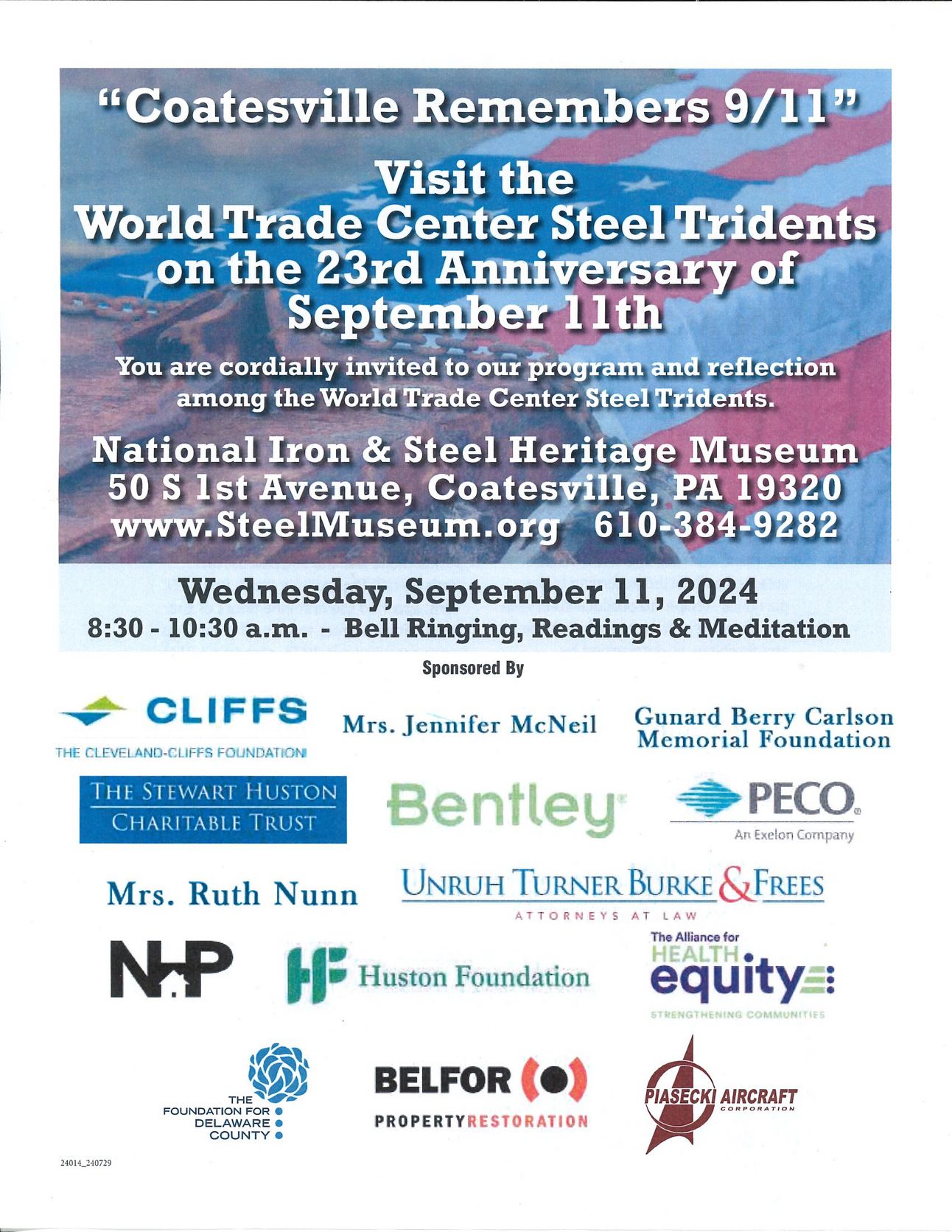COATESVILLE, PA β On September 11, 2024, Coatesville's National Iron & Steel Heritage Museum will commemorate the 23rd anniversary of the 9/11 attacks with a reflective event among the World Trade Center Steel Tridents. The program, held from 8:30 to 10:30 a.m., will include bell ringing, readings, and meditation to honor those lost and celebrate the spirit of resilience. The event, supported by a range of local sponsors, aims to foster community unity and remembrance. For more details, the public is encouraged to contact the museum or visit their website.