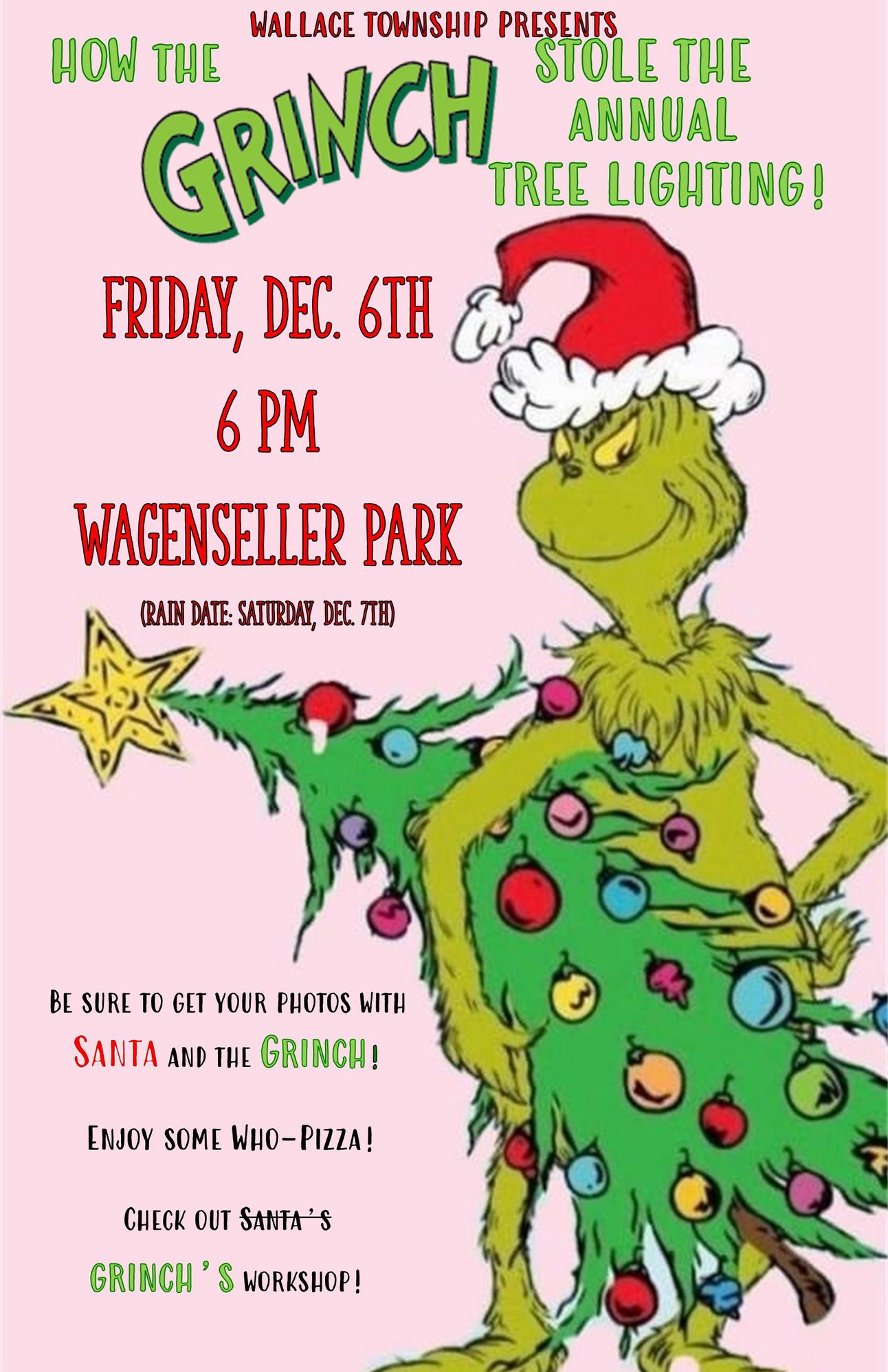 WALLACE TWP — Wallace Township’s holiday festivities will take a humorous turn this year as the Grinch joins Santa in “stealing” the annual tree lighting at Wagenseller Park on December 6. Designed for all ages, the event offers families an evening of holiday fun, with photo opportunities featuring both Santa and the Grinch. Guests can savor themed treats, including “Who-Pizza,” and enjoy a Grinch-inspired workshop filled with holiday crafts and activities.