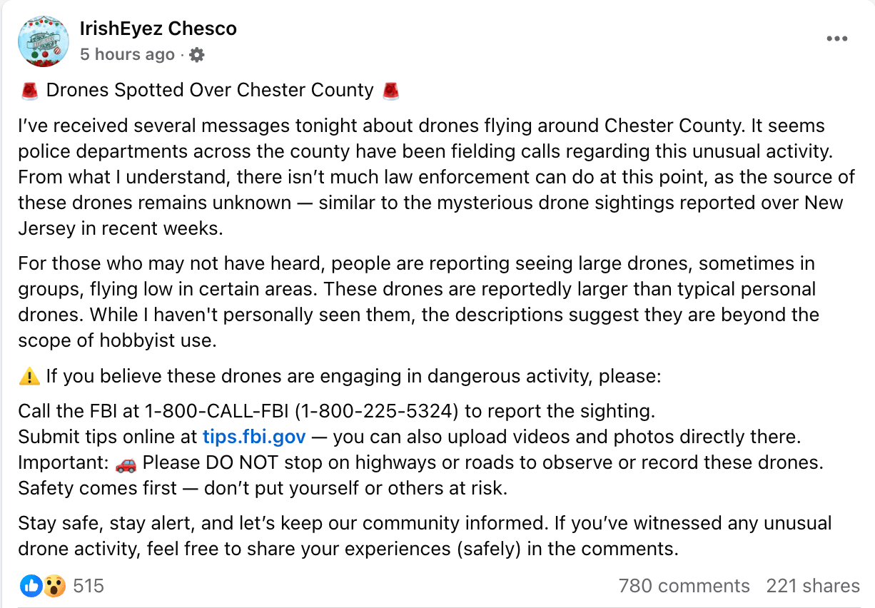 Mysterious Low-Flying Drones Prompt Concern Across Chester County