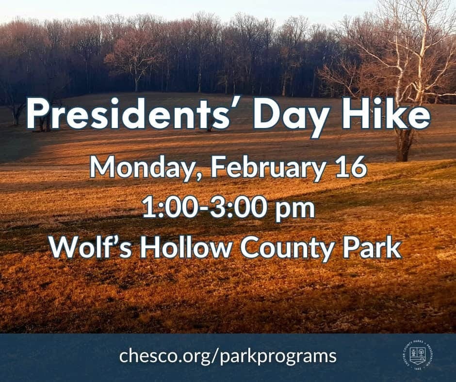 ATGLEN, PA — Chester County Parks and Preservation has openings remaining for a Presidents' Day guided hike at Wolf's Hollow County Park on February 16. Ranger Henry will lead the moderate four-mile trek from 1:00 to 3:00 p.m. Park officials hope recent snowfall will melt before the midday excursion. The holiday hike offers residents an opportunity to explore the county park system during a typically quiet period for outdoor recreation. Advance registration is required for participants.