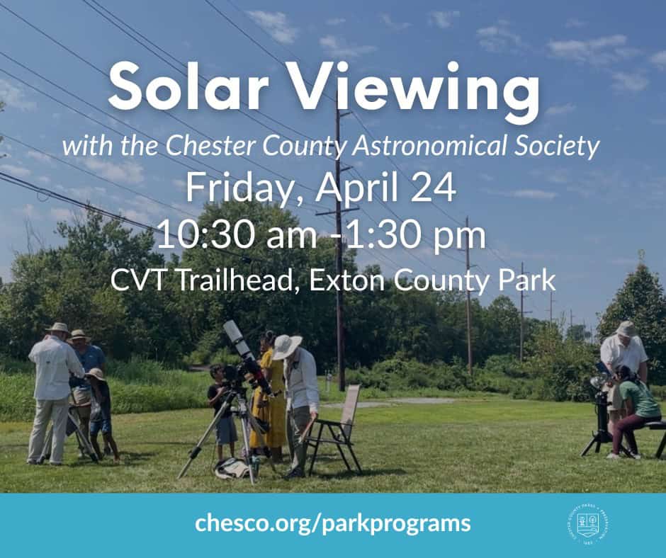EXTON, PA — On April 24, Chester County Parks + Preservation and the Chester County Astronomical Society will offer the public a rare look at the sun during solar maximum — the peak of the star's 11-year activity cycle — at a free viewing event along the Chester Valley Trail at Exton County Park. Running from 10:30 a.m. to 1:30 p.m., the event gives participants access to three different telescopes, each revealing a distinct layer of solar activity: hydrogen-alpha imaging of plasma prominences and sunspots, full-spectrum photospheric views, and a research-grade spectroscope mapping the sun's elemental composition. Informational displays on heliophysics and spectroscopy will be on hand as well. Because solar maximum occurs only once every 11 years, organizers describe this as a particularly compelling moment to observe phenomena that are otherwise invisible to the naked eye. The event is free and open to all ages, though space is capped at 50 participants. Registration is open through July 1, and the meeting point is the Chester Valley Trailhead at 132 Church Farm Lane in Exton.